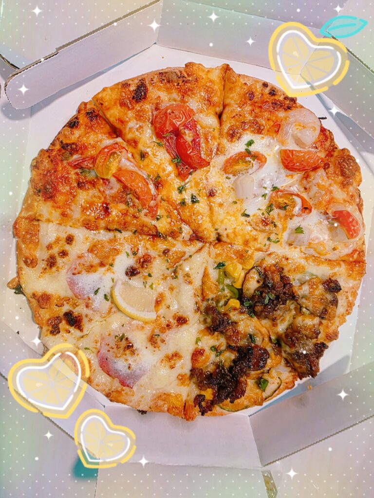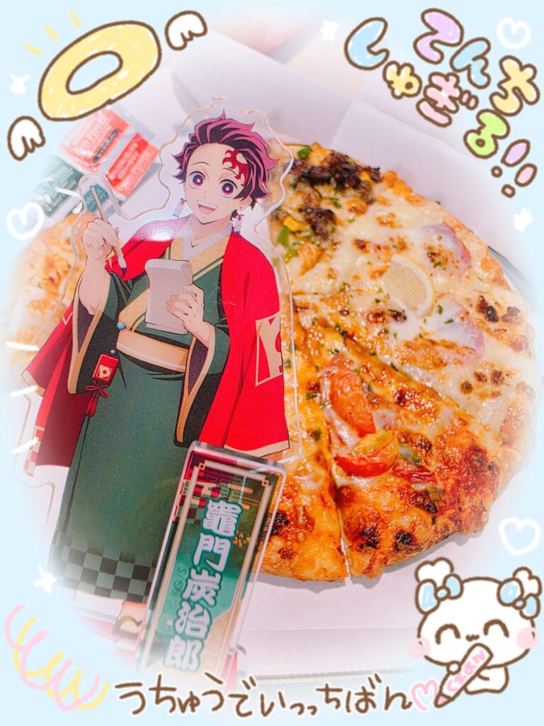 ピザ自体もめちゃくちゃ好みで、炭治郎の炭焼きのやつ美味しかった!蜜璃ちゃんのハニーのやつも甘じょっぱくて大好き!時透くんのも実弥のもうまかった!